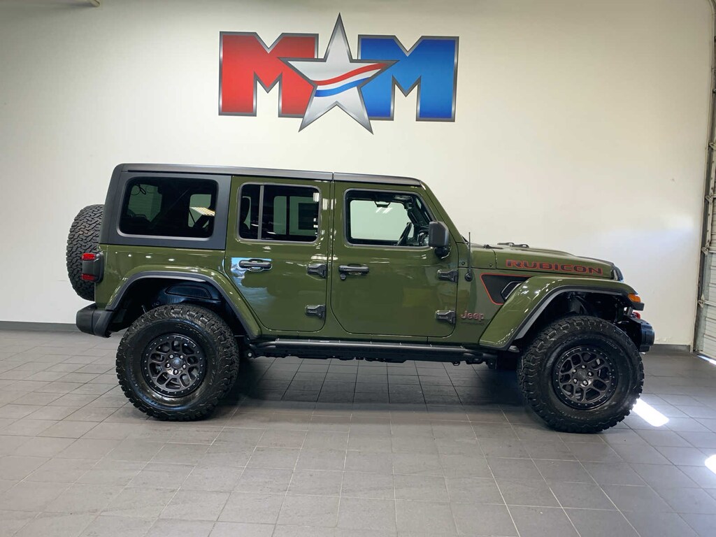 Tip Start, Selec-Speed Control, Tires: LT315/70R17C 113/110S, Dana M210 Wide HD Tube Front Axle, Wheel Flare Extensions, MOPAR Tire Relocation Kit, Wheels: 17" x 8" Beadlock Capable, Anti-Lock 4-Wheel Disc Perf Brakes, 35" Tire Suspension, GVWR: 6,100 lbs, MOPAR Hinge-Gate Reinforcement, MOPAR Jack Spacer, 4.56 Rear Axle Ratio, Premium Black Sunrider Soft Top w/Dual Top Group, Black 3-Piece Hard Top, Freedom Panel Storage Bag, Rear Window Defroster, Rear Window Wiper/Washer, No Soft Top, Leather Wrapped Park Brake Handle, Leather Wrapped Shift Knob, Premium Door Trim Panel, Steel Front Bumper, Steel Rear Bumper, Daytime Running Lamps LED Accents, Front LED Fog Lamps, LED Premium Reflector Headlamps, LED Taillamps, Heated Steering Wheel, Heated Front Seats, ParkSense Rear Park Assist System, Blind Spot & Cross Path Detection, Class II Receiver Hitch, 700 Amp Maintenance Free Battery, 7 & 4 Pin Wiring Harness, 240 Amp Alternator, Auxiliary Switches, INTEGRATED OFF-ROAD CAMERA, MOPAR HARDTOP HEADLINER, SARGE GREEN CLEARCOAT, MOPAR SATIN BLACK GRILLE, CORNING GORILLA GLASS, 600 Amp Maintenance Free Battery, 48V Belt Starter Generator, Delete Alternator, REMOTE START SYSTEM. Jeep Unlimited Rubicon with Sarge Green Clearcoat exterior and Dark Saddle/Black interior features a V6 Cylinder Engine with 285 HP at 6400 RPM*.